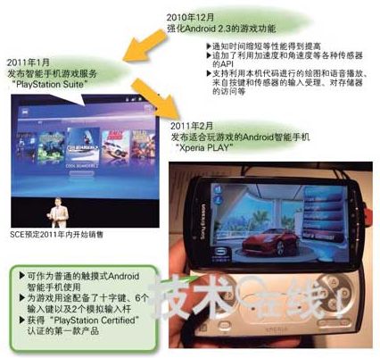 索尼愛立信發(fā)布了獲得SCE“PlayStation Certified”認證的首款智能手機“Xperia PLAY”。索尼愛立信還為強化Android 2.3的游戲功能做出了貢獻。2011年3月上市。