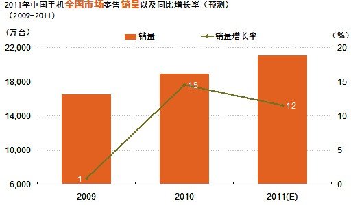 2011年上半年中國的手機(jī)市場在3G加速發(fā)展,智能手機(jī)大力推廣以及運(yùn)營商的推動共同作用下延續(xù)了2010年的增長勢頭,但是2011年下半年的手機(jī)市場規(guī)模與上半年相比將略有下降,銷量將達(dá)到1.02億臺,銷售額將達(dá)到1166億元。據(jù)GfK預(yù)測,2011年全年手機(jī)銷售額將達(dá)到2352億元,手機(jī)銷量將達(dá)到2.1億臺,同比上升12%。