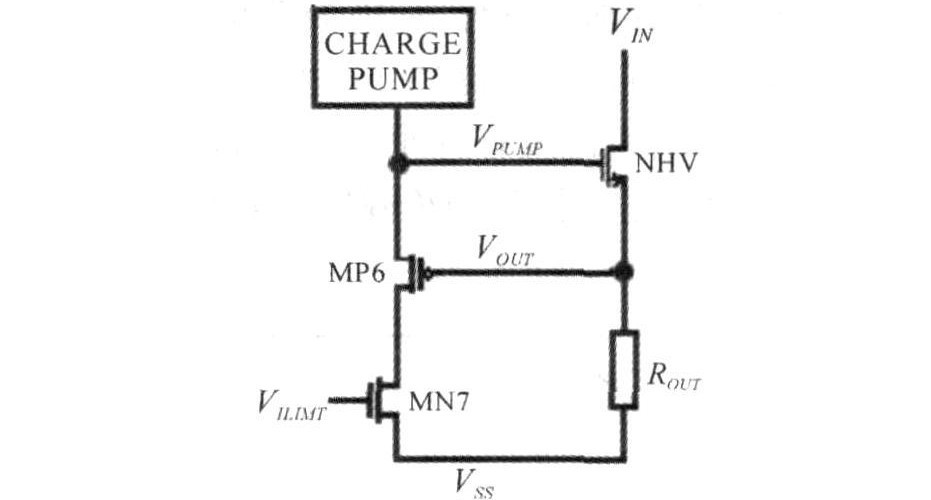 當(dāng)出現(xiàn)過載和短路故障時,負載電流達到數(shù)安培,需要精確的限流電路為功率管和輸入電源提供保護。對于MOS器件,只有工作在飽和區(qū)時的電流容易控制。限流就是通過反饋負載電壓,調(diào)節(jié)電荷泵輸出電壓來實現(xiàn)的。圖4是限流電路的原理圖。