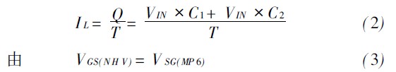 當(dāng)負載電流超過1A時,電流限信號(VLIMIT)為高電平,MN7導(dǎo)通,柵電荷經(jīng)MP6流向地,柵電壓減小,功率管工作在飽和區(qū)。C1、C2為電荷泵電容值,在一個時鐘周期T內(nèi),由電荷泵充入的柵電荷為:
