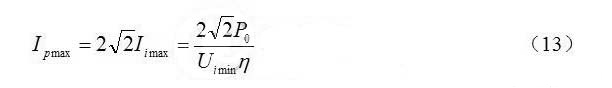 為避免音頻噪聲,在輸入電壓范圍內(nèi),開(kāi)關(guān)頻率應(yīng)在20kHz以上。從以上分析可知,在最高輸入電壓峰值時(shí),開(kāi)關(guān)頻率最低。故假定在最高輸入電壓峰值的開(kāi)關(guān)周期為50μs.由式(11)求得