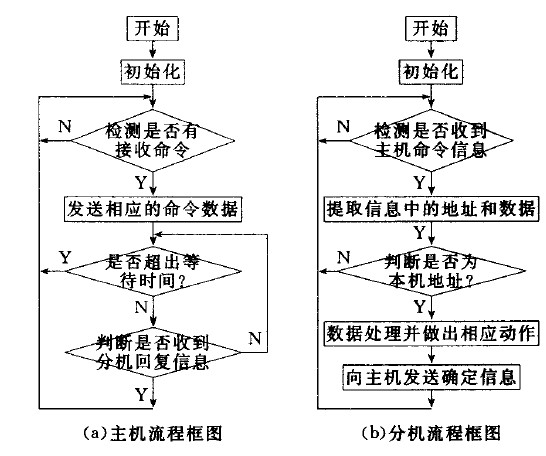 分機上電復位后進行初始化,然后等待接收主機發(fā)送的命令信息。接收到命令信息后,從中提取地址和數據信息,若為本分機地址,則對數據進行處理并作出響應,同時向主機發(fā)送確定信息;若非本分機地址,則返回,繼續(xù)等待主機發(fā)送的命令信息。分機主程序流程圖如圖6(b)所示。