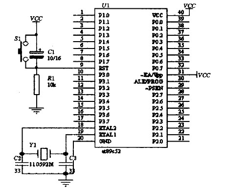 本單片機通過RS232串行通信接口與GSM 模塊通信,提取GSM 設備的短信,發(fā)送相關的信息,并通過串行通信接口與紅外模塊相連,利用紅外模塊,達到主、分機之間的通信,因此,選用AT89S52芯片。控制上需要用到兩個串行接口,但89S52只有一個串口,故還需要在程序中進行模擬串行接口通信。其最簡外部接線電路如圖2所示。