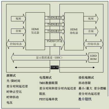 圖1:HDMI最小化傳輸差分信號(TMDS)的邏輯連接以及CTS規(guī)范所要求的核心測試。