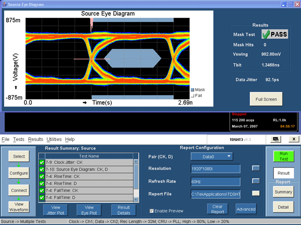 圖2是一次利用HDMI一致性測試軟件進(jìn)行HDMI V1.3源端測試得到的結(jié)果。同時,為保證全面體現(xiàn)信號特點(diǎn),CTS 1.3b還規(guī)定了捕捉信號所需的最小示波器記錄長度。根據(jù)該規(guī)定,示波器至少應(yīng)能累積40萬個單位時間間隔(或Tbit)來繪制眼圖。在16 M/20 M的記錄長度下,示波器至少能捕捉40萬單位時間間隔的低分辨率信號,或260萬單位時間間隔的高分辨率信號??紤]到高達(dá)3.4Gbps的數(shù)據(jù)率,高采樣率(高于10GS/s)下示波器的最小記錄長度就應(yīng)大于16M。