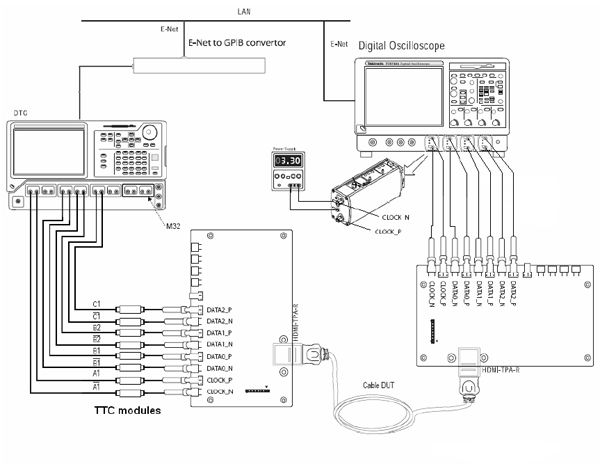 該例中,數(shù)字熒光示波器通過一條GPIB電纜與TMDS信號發(fā)生器DTG5334相連,需要時還可通過一條GPIBUSB-B電纜將其與抖動插入信號發(fā)生器AWG/AFG相連。HDMI設(shè)計(jì)與測試工程師可以在一套閉環(huán)裝置中控制這些信號發(fā)生器,利用示波器上自帶的“一鍵運(yùn)行”一致性測試軟件自動實(shí)現(xiàn)復(fù)雜的電纜和接收器測試。該例中采用的閉環(huán)裝置大大縮短了測試時間,也消除了測試裝置的非線性。
