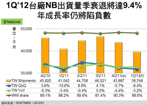 2012年第1季進(jìn)入歐美傳統(tǒng)淡季,亞洲傳統(tǒng)旺季需求亦不甚熱絡(luò),加上硬盤缺貨在1月最為嚴(yán)重,2月之后雖可逐月顯著改善,但英特爾(Intel)新CPU Ivy Bridge NB 4月上市在即,臺(tái)廠于3月即將開始大量出貨,致使1月硬盤未能滿足的舊CPU NB訂單將不具補(bǔ)單意義,進(jìn)而造成臺(tái)廠NB出貨量將再較上季衰退9.4%。也由于全球景氣不振,NB市況持續(xù)低迷,DIGITIMES Research資深分析師兼主任簡(jiǎn)佩萍預(yù)估,第1季臺(tái)廠NB出貨量將再較2011年同期衰退3.2%,致使連續(xù)兩年第1季臺(tái)廠NB出貨量年成長(zhǎng)率均為負(fù)值。