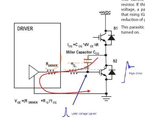 那么在來(lái)看看為何400V加上去,就會(huì)在下管上的G級(jí)上產(chǎn)生尖峰。借花獻(xiàn)佛,抓個(gè)圖片來(lái)說(shuō)明: