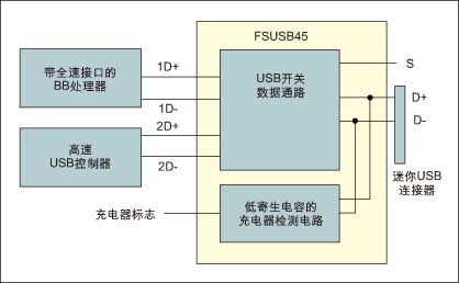 隨著目前的市場趨勢向單一USB充電器/數據端口的轉變,特殊應用USB開關已經成為帶充電器檢測功能的手機設計中的一種常規(guī)配置。圖2是這種開關應用的一個范例。