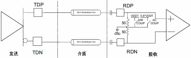 圖3是TLK3132高速串行接口的AC耦合框圖,采用CML高速電平接口,發(fā)送側(cè)內(nèi)部集成了50歐姆的匹配電阻。接收端支持DC和AC耦合,若采用直流耦合時(shí),共模電壓由發(fā)送側(cè)決定,匹配電阻直接上拉到VDDT,若采用交流耦合,為得到最優(yōu)的共模偏置電壓,選擇芯片內(nèi)部0.8VDDT的偏置電壓。在實(shí)際電路設(shè)計(jì)中,推薦采用交流耦合方式,容易實(shí)現(xiàn)不同接口的電平轉(zhuǎn)換,并可去除共模噪聲,避免外界噪聲對(duì)接收端的影響。
