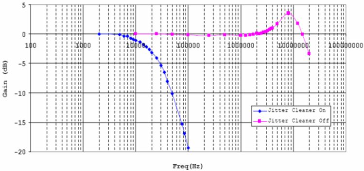 2)由于串并模塊里的高頻倍頻器環(huán)路帶寬很大,最大可達(dá)30MHz左右。故TLK3132內(nèi)部集成了一顆基于LC振蕩器的抖動(dòng)濾除鎖相環(huán),環(huán)路帶寬通常設(shè)置在幾百KHz以內(nèi),可以對(duì)輸入?yún)⒖紩r(shí)鐘進(jìn)行濾除,降低參考時(shí)鐘對(duì)幾百KHz 以上抖動(dòng)性能的要求,圖6是TLK3132發(fā)送鏈路在抖動(dòng)濾除器打開(kāi)和關(guān)閉下的環(huán)路傳遞函數(shù)。此外,抖動(dòng)濾除器也可對(duì)鏈路恢復(fù)的時(shí)鐘(只可接收CH0通道的恢復(fù)時(shí)鐘RXBCLK(0))進(jìn)行抖動(dòng)濾除,提高恢復(fù)時(shí)鐘的信號(hào)質(zhì)量。