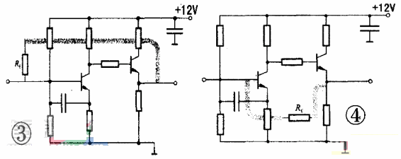 如圖3所示放大電路,由于反饋導(dǎo)線越過放大器基極電阻??赡墚a(chǎn)生寄生耦合,影響電路工作。圖4所示電路的布設(shè)將反饋元件置于中間,輸出導(dǎo)線遠(yuǎn)離前級元件,避免干擾。