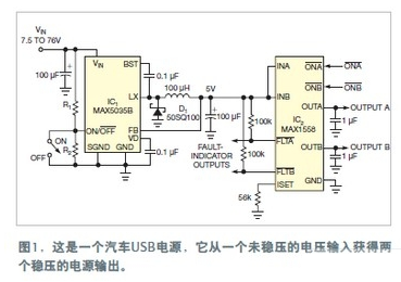 PND(個人導航設備)一類的汽車配件通常會用一個插入到點煙器的簡單適配器,獲得自己的電源并充電。不過,有時候可能想同時為兩個設備供電或充電。圖1中的電路可以完成這個任務。