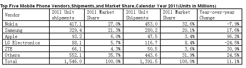 據(jù)IDC 發(fā)布的2011 年第四季度全球手機(jī)市場(chǎng)數(shù)據(jù)顯示:蘋(píng)果成為全球第三大手機(jī)廠商(不是智能手機(jī)領(lǐng)域)。同步匯總的2011 年全年手機(jī)市場(chǎng)數(shù)據(jù)中.蘋(píng)果同樣強(qiáng)勢(shì)上升,以9320 萬(wàn)臺(tái)iPhone 銷(xiāo)量佳績(jī)穩(wěn)坐“全球第三大手機(jī)廠商”寶座,其中中國(guó)廠商中興以6610 萬(wàn)臺(tái)手機(jī)銷(xiāo)量成為全球第五大手機(jī)制造商(華為非上市公司無(wú)須公布財(cái)報(bào))。