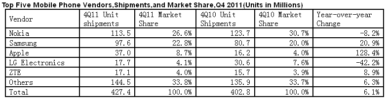 2011 年第四季度,全球共賣(mài)出4.274 億部手機(jī).同比去年( 4.028 億部)上升6.1 % ,這一漲勢(shì)高于IDC此前預(yù)測(cè)的4.4 % 漲幅,但低于2011 年第三季度9.3%的增幅。其中功能機(jī)的市場(chǎng)份額比預(yù)期的衰減速度更快,市場(chǎng)增幅為兩年來(lái)最低。