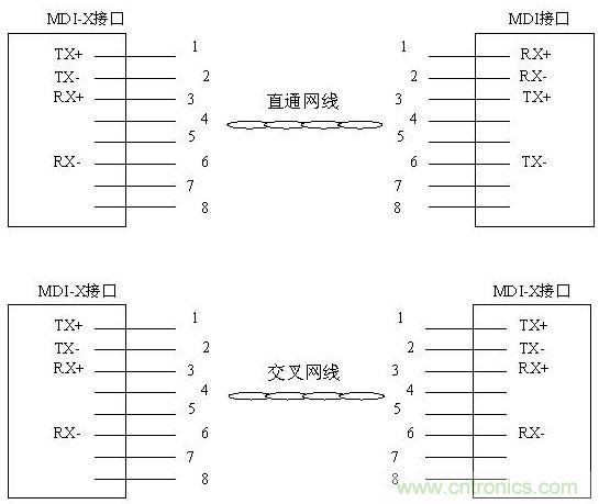 從以上分析可看出,網(wǎng)線連接兩個接口的目的是使兩端TX與RX對接起來,因此,當MDI-X接口與MDI接口相連時需使用直通網(wǎng)線,而MDI接口與MDI接口相連或MDI-X接口與MDI-X接口相連時需使用交叉網(wǎng)線。