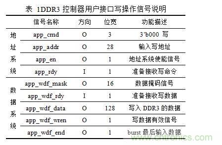 DDR3存儲器控制模塊用戶接口寫操作有兩套系統(tǒng),一套是地址系統(tǒng),一套是數(shù)據(jù)系統(tǒng)。用戶接口寫操作信號說明如表 1所示。