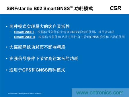可穿戴設(shè)備應(yīng)用。該低功耗器件現(xiàn)已全面投入生產(chǎn),不僅可大幅度降低功耗且不影響定位精度,還可提供多衛(wèi)星GNSS支持,可滿足所有地區(qū)對(duì)GNSS的需求,包括美國(guó)的GPS、歐洲的伽利略、俄國(guó)的Glonass及中國(guó)的北斗衛(wèi)星系統(tǒng)。此外,SiRFstar 5e B02還搭載了CSR全新的SmartGNSS技術(shù),可提供兩種模式最大程度地降低功耗,并能夠根據(jù)信號(hào)條件及衛(wèi)星可用性自主管理GNSS系統(tǒng)的應(yīng)用。