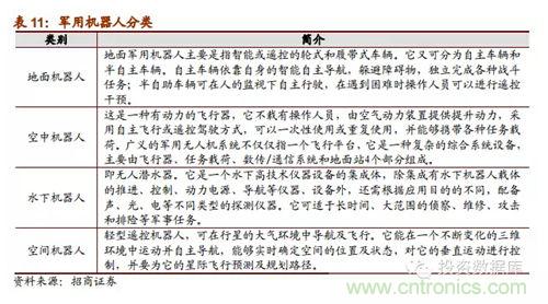 (五)軍事機(jī)器人是21世紀(jì)各國(guó)軍事安全重點(diǎn)戰(zhàn)略:蒂爾集團(tuán)稱未來10年全球無人機(jī)研發(fā)投入和采購(gòu)需求將達(dá)到940億美元。軍用機(jī)器人強(qiáng)國(guó)包括美德英法意以日韓,這些國(guó)家不僅在技術(shù)處于研究的先列,其產(chǎn)品已經(jīng)在軍事上有了實(shí)際運(yùn)用;我國(guó)與這些強(qiáng)國(guó)的技術(shù)差距明顯,受政策支持,軍事機(jī)器人相關(guān)企業(yè)發(fā)展前景明顯良好,可能成為企業(yè)未來強(qiáng)勁的收入保證。