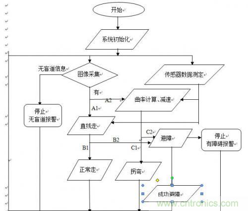說明:上電之后,CPU開始工作。首先,CPU開始控制攝像頭和傳感器同時(shí)工作,同時(shí)采集信息,把采集回來的信息進(jìn)行分析,在CPU內(nèi)部進(jìn)行A/D或D/A轉(zhuǎn)換,然后將轉(zhuǎn)換后的信息傳遞給舵機(jī),使舵機(jī)在CPU的控制下進(jìn)行工作。