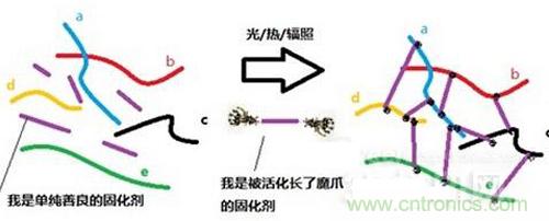 把相對容易流動的液體材料變成固體,這種思路其實并不新鮮,硫化橡膠就是這種材料加工方式的典型例子。那么,固化的過程是如何發(fā)生的呢?下面,就讓我們來看圖說話: