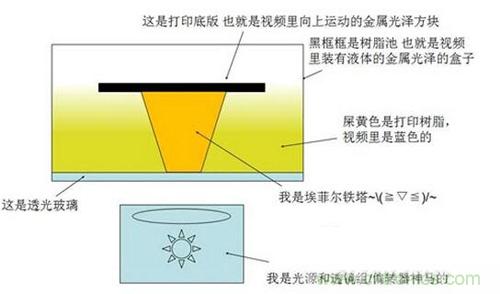 簡單來說,立體光固化的過程就是光照射光敏樹脂表面,使其固化成薄薄的一層固體,已經(jīng)固化完成的部分被一塊基板黏附著,逐漸與光照射面拉開一定距離(通常是每次移動十幾個微米),然后在上一層固化樹脂的基礎(chǔ)上再進(jìn)行下一層的照射和固化。經(jīng)過層層固化疊加之后,最終就形成一個完整的立體結(jié)構(gòu)。下面這張圖表示的就是SLA設(shè)備的基本結(jié)構(gòu),固化反應(yīng)發(fā)生在打印樹脂與透光玻璃板的交界面上,由于光照射面在液面的下方,打印的過程看上去就像從液體里“拉”出了打印制件一樣。