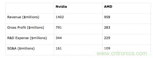另一個(gè)重要的優(yōu)勢(shì)是,Nvidia公司的財(cái)務(wù)實(shí)力在恢復(fù)。目前Nvidia是盈利的,并有望在研發(fā)中比AMD投入更多的的資金,而此前則不得不削減營運(yùn)費(fèi)用。下面的表格提供了兩家公司最新一個(gè)季度的財(cái)務(wù)狀況比較: