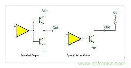 關(guān)于推挽輸出和開漏輸出,最后用一幅最簡單的圖形來概括:該圖中左邊的便是推挽輸出模式,其中比較器輸出高電平時下面的PNP三極管截止,而上面NPN三極管導通,輸出電平VS+;當比較器輸出低電平時則恰恰相反,PNP三極管導通,輸出和地相連,為低電平。右邊的則可以理解為開漏輸出形式,需要接上拉。
