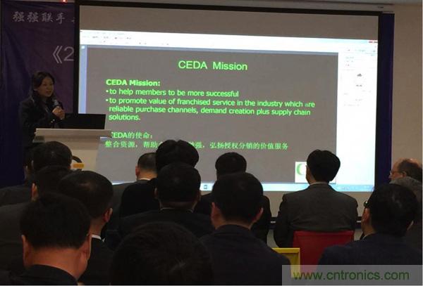 圖1:《2015中國(guó)電子授權(quán)分銷(xiāo)商名錄》發(fā)布會(huì)暨行業(yè)領(lǐng)袖峰會(huì),CEDA常務(wù)理事Amy Wang介紹CEDA的使命