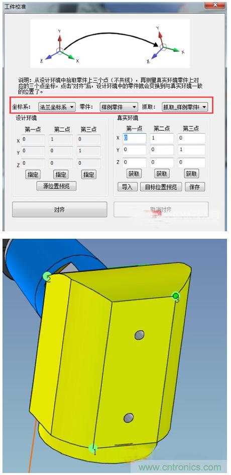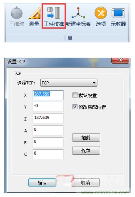 然后,我們對零件的三維模型進行工件校準以及對工具的TCP進行設置,完成此步驟后零件和工具的位置就已經(jīng)和實際的位置保持一致了。