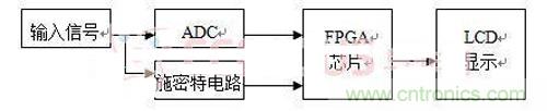 將輸入的模擬信號(hào)分成2路,一路經(jīng)ADC輸入FPGA 芯片 ,另一路經(jīng)斯密特電路輸入給FPGA 。FPGA外接20MHz的晶振,通過(guò)FPGA 內(nèi)部的鎖相環(huán)倍頻至200MHz,即周期為5ns的方波信號(hào)。用此方波信號(hào)作為時(shí)間基準(zhǔn),對(duì)經(jīng)斯密特電路輸入信號(hào)的周期進(jìn)行測(cè)量,得到被測(cè)信號(hào)周期=N*5ns,則等效采樣的時(shí)間間隔=m*(N*5ns)+5ns。根據(jù)等效采樣原理,此時(shí)的采樣率相當(dāng)于1/5ns=200MHz,利用LCD顯示技術(shù),可以看到此效果。