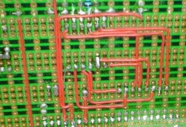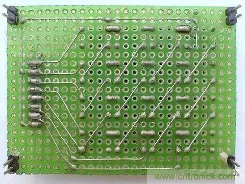 對于萬能板的焊接方法,一般是利用前面提到的細導線進行飛線連接,飛線連接沒有太大的技巧,但盡量做到水平和豎直走線,整潔清晰如下圖。
