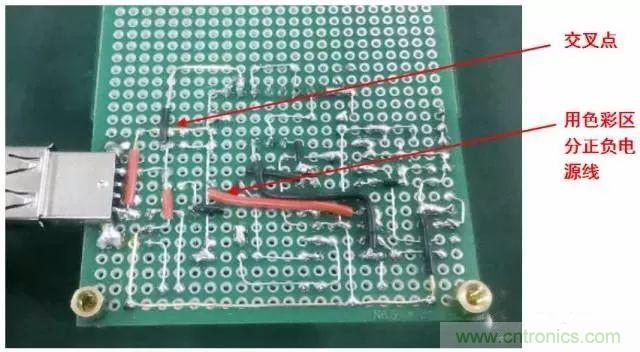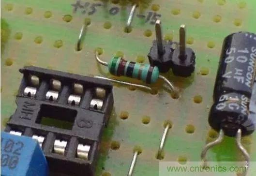 洞洞板的焊接需要大量的跨接、跳線等,不要急于剪斷元器件多余的引腳,有時候直接跨接到周圍待連接的元器件引腳上會事半功倍。另外,本著節(jié)約材料的目的,可以把剪斷的元器件引腳收集起來作為跳線用材料。