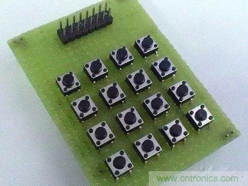 圖a是矩陣鍵盤電路,圖b是筆者焊接的矩陣鍵盤。這是一個利用了元器件自身結構的典型例子:圖b中的輕觸式按鍵有4只腳,其中兩兩相通,我們便可以利用這一特點來簡化連線,電氣相通的兩只腳充當了跳線。讀者可以對照圖c好好體會一下。