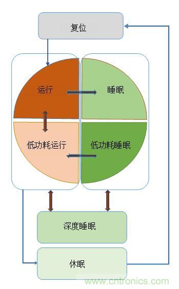 在考慮 MCU 的功耗模式時,超越其基本架構(gòu)十分重要。例如,標準 ARM CPU 內(nèi)核支持運行、睡眠和深度睡眠。附加功耗模式通常由特定的 MCU 供應商添加。例如,賽普拉斯的 PSoC 6 BLE MCU可執(zhí)行包括,低功耗運行、低功耗睡眠和休眠狀態(tài)在內(nèi)的六種工作功耗模式。