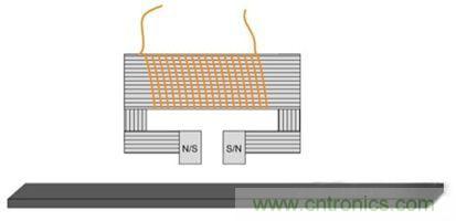 在實(shí)用化系統(tǒng)中需要用到一個(gè)寫入磁頭,它其實(shí)就是繞在磁心上的一個(gè)線圈。通過控制線圈中的電流方向可以很容易編程磁場方向。這有助于在磁卡上形成南北極圖案。磁極之間的空隙越窄,磁卡上能夠編程的數(shù)據(jù)密度就越高。