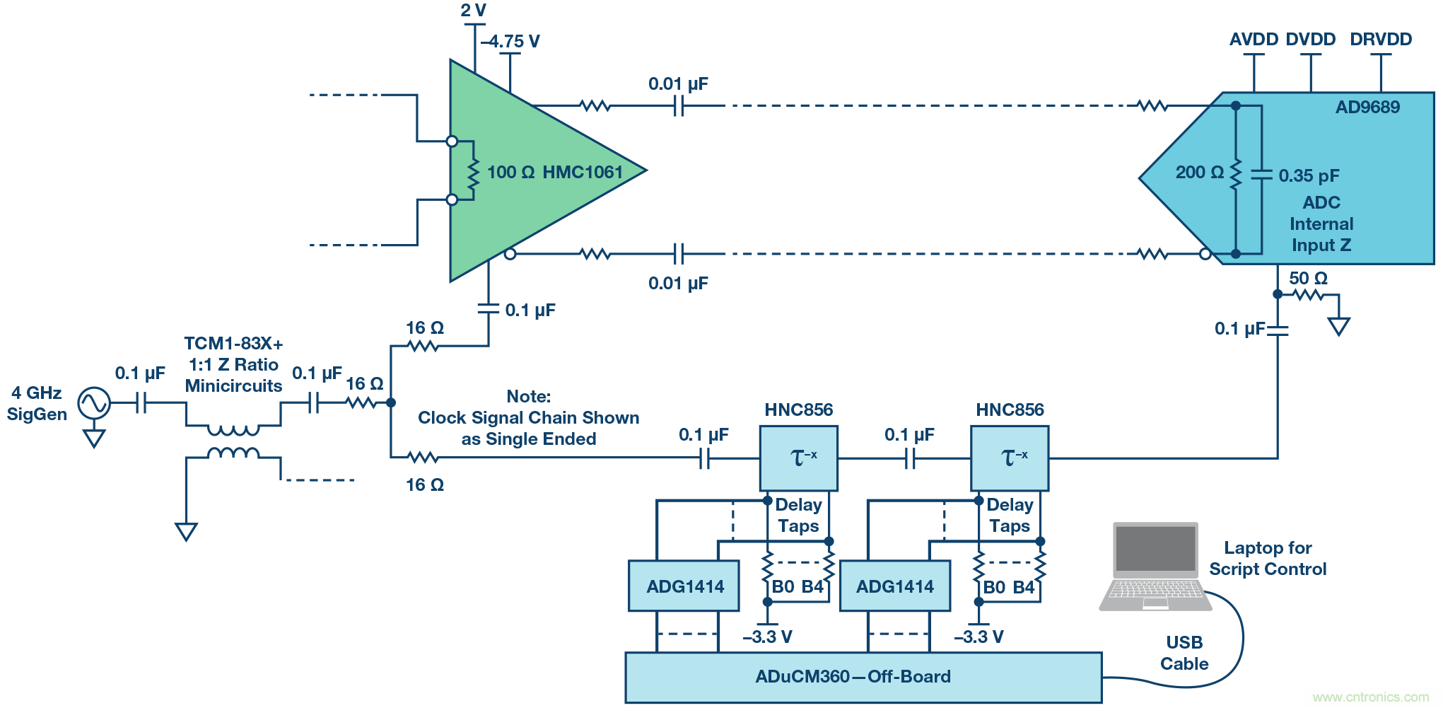 在電路板上完成該過(guò)程可能冗長(zhǎng)乏味,因?yàn)榧埫娣治隹赡懿粫?huì)考慮PCB板上時(shí)鐘走線(xiàn)傳播間隔造成的相應(yīng)延遲,內(nèi)部器件組延遲,ADC孔徑延遲,以及將時(shí)鐘分為兩個(gè)不同段所涉及到的相關(guān)電路(一條時(shí)鐘走線(xiàn)用于THA,另一條時(shí)鐘走線(xiàn)用于ADC)。設(shè)置THA和ADC之間延遲的一種方法是使用可變延遲線(xiàn)。這些器件可以是有源或無(wú)源的,目的是正確對(duì)準(zhǔn)THA采樣過(guò)程的時(shí)間并將其交給ADC進(jìn)行采樣。這保證了ADC對(duì)THA輸出波形的穩(wěn)定保持模式部分進(jìn)行采樣,從而準(zhǔn)確表示輸入信號(hào)。