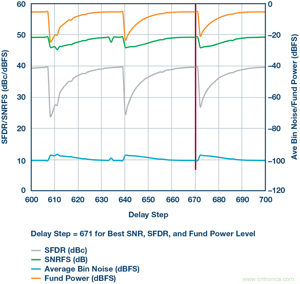 結(jié)果如圖3a所示,基波功率、SFDR和SNR將隨所應(yīng)用的每個(gè)設(shè)置而變化。如圖所示,當(dāng)把采樣位置放在更好的地方(THA將樣本送至ADC的過(guò)程之中)時(shí),基波功率將處于最高水平,而SFDR應(yīng)處于最佳性能(即最低)。圖3b為延遲映射掃描的放大視圖,延遲設(shè)定點(diǎn)為671,即延遲應(yīng)該保持固定于此窗口/位置。請(qǐng)記住,延遲映射程序僅對(duì)系統(tǒng)的相關(guān)采樣頻率有效,如果設(shè)計(jì)需要不同的采樣時(shí)鐘,則需要重新掃描。本例中,采樣頻率為4 GHz,這是該信號(hào)鏈中使用的THA器件的最高采樣頻率。
