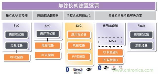· 全整合式無線SoC:這是一種單芯片的單一建置方案,適用于特定的無線技術(shù),尤其是用于物聯(lián)網(wǎng)應(yīng)用的低功耗藍(lán)牙技術(shù)。鏈路層和PHY整合于SoC中,以執(zhí)行所有的軟件堆棧和應(yīng)用程序代碼。