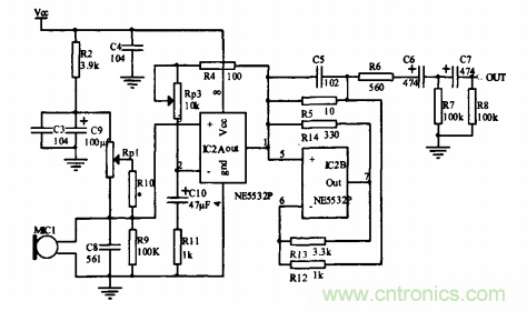 監(jiān)控拾音器的輸出加入了由c6、R7、c 7、R8構成兩級Rc高通濾波器,濾除信號中的高頻成分,同時電容又起了隔直的作用,使電路達到了較好的性能。
