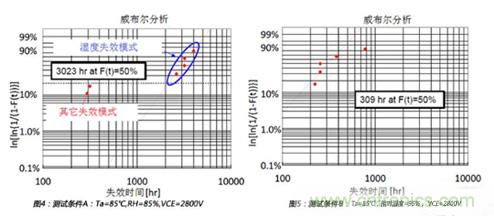 如圖4所示,在測試條件A的平均壽命為3023個小時。同樣,如圖5所示,在測試條件B的平均壽命為309個小時。所以,從相對濕度85%到相對濕度95%,加速因子αf_A-B通過計算為3023/309=9.78。相對濕度的經(jīng)驗影響因子x通過下式計算: