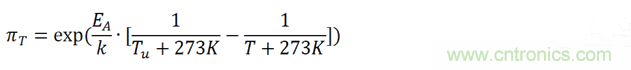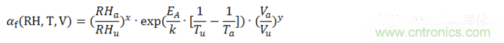 公式中,αf為測試的加速因子,也就是加速(后綴為a)測試條件下MTTF(Mean Time To Failures,平均無故障時間)與參考(后綴為u)測試條件下MTTF之比。EA是活化能,在0.79eV和0.95eV之間,k為玻爾茲曼常數(shù)。指數(shù)x為相對濕度的影響,指數(shù)y為電壓的影響,都是經(jīng)驗數(shù)據(jù),但是必須通過實際評估來確認。我們把此加速模型擴展到壽命預估模型中。