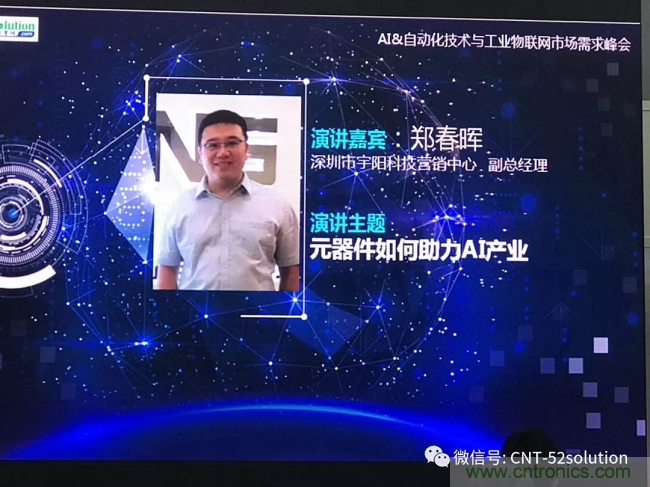 為積極推動跨行業(yè)的電子開發(fā)需求與方案服務商的對接,大力發(fā)展技術外包服務,服務國家創(chuàng)新戰(zhàn)略,搶占人工智能技術和應用的制高點,近日,我愛方案網(wǎng)策劃主辦了2018AI&自動化技術與工業(yè)物聯(lián)網(wǎng)市場需求峰會,這是第六屆中國電子信息博覽會的核心活動。中國優(yōu)秀的元件技術供應商宇陽科技副總鄭春暉在峰會上做《元器件如何助力AI產(chǎn)業(yè)》的大會報告。