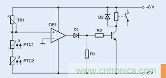 至于TR1,在設(shè)置時(shí),其最大值應(yīng)約等于常溫電阻的兩倍。而TR1還能夠相應(yīng)地進(jìn)行微調(diào)。在冷態(tài)下,非反相輸入端將出現(xiàn)電位,而這一電位相比反相輸入端電位則具有較高的負(fù)電位。這則意味著比較器輸出端出現(xiàn)負(fù)電壓。若某一個(gè)或兩個(gè)正溫度系數(shù) (PTC) 傳感器達(dá)到相應(yīng)的溫度限值,則分壓器的電位將出現(xiàn)變化,而比較器則將進(jìn)行切換,并發(fā)送一個(gè)正輸出信號,進(jìn)而切斷晶體管。