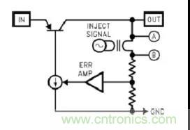 環(huán)路的不穩(wěn)定來自于相位移量,我們可以在反饋回路中通過變壓器注入正弦小信號,如下圖所示,Loop Gain=Va/Vb,從Vb傳入交流小信號,同過回路產(chǎn)生相移到達(dá)Va。這樣可以計(jì)算回路增益,相位的偏移量。(此處以LDO分析)