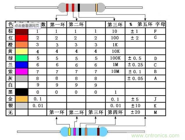 電阻器上用不同顏色的環(huán)來(lái)表示電阻的標(biāo)稱阻值,常見的電阻器有四色環(huán)電阻和五色環(huán)電阻。四色環(huán)電阻,一般是碳膜電阻,用三個(gè)色環(huán)來(lái)表示阻值,用一個(gè)色環(huán)表示誤差。五環(huán)電阻一般是金屬膜電阻,精度更高,常用四個(gè)色環(huán)表示阻值,另一個(gè)色環(huán)表示誤差。