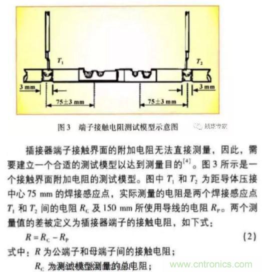 低電平接觸電阻測量法是使用微型歐姆表測試導(dǎo)線壓接和端子接觸區(qū)域的電阻。如圖3所示,使用微型歐姆表測量兩個焊接感應(yīng)點(diǎn)T、T間的電阻和l50mm長度的所使用導(dǎo)線的電阻,據(jù)此可計(jì)算出所需要的接觸電阻。