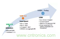 畢竟USB4是下一代USB數(shù)據(jù)規(guī)范,增加了接口帶寬并支持其他協(xié)議共享物理接口。共享USB接口的最大協(xié)議是英特爾的Thunderbolt。自2000年以來(lái),USB-IF一直在系統(tǒng)地提高接口的吞吐量,以滿足客戶不斷增長(zhǎng)的數(shù)據(jù)需求。從2000年的USB 2.0開(kāi)始,到2013年的USB3.2,USB數(shù)據(jù)速率已從480Mbps擴(kuò)展到20Gbps。USB4將進(jìn)一步提高數(shù)據(jù)速率到40Gbps吞吐量。