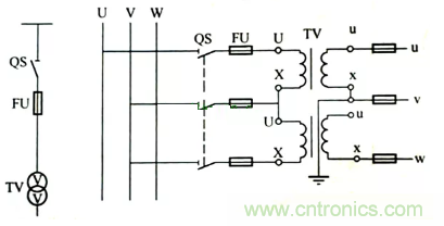 單相電壓互感器一次側(cè)端子為U、X,二次側(cè)為u、x;三相電壓互感器一次側(cè)端子為U、V、W,二次側(cè)為u、ⅴ、w、0。電壓互感器具有首端標志u的端子應(yīng)和儀表的相線端連接,末端x接地并與儀表中性線端連接。