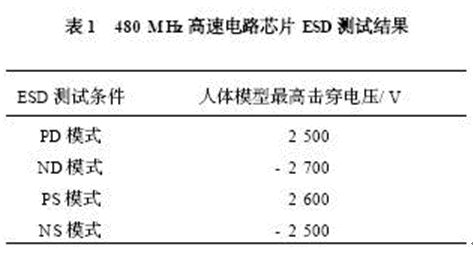 上述ESD 保護(hù)電路(見圖3) 在被應(yīng)用于設(shè)計(jì)USB2. 0 接口芯片中。 該芯片的最高時(shí)鐘頻率為480 MHz ,采用TSMC 公司的0. 25μm 混合信號(hào)工藝進(jìn)行了流片。 流片后的芯片用抗靜電測(cè)試儀( Thermo Keytek 公司,型號(hào): ZAPMASTER 714)進(jìn)行了測(cè)試,其結(jié)果如表1 所示,給出了在上述4 種不同的放電模式下的耐壓值。 測(cè)試結(jié)果表明在所有測(cè)試條件下的人體模型最高擊穿電壓(V) 超過了正負(fù)2 500 V。